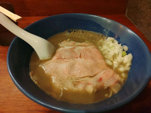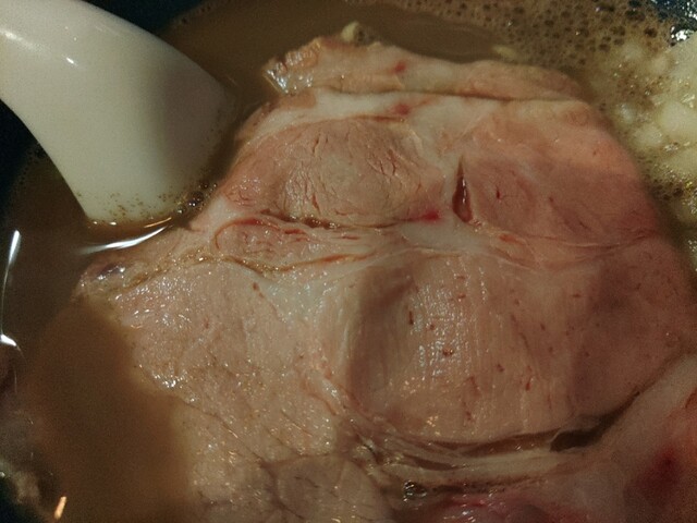 見た目はシンプルで、具はチャーシューとネギのみのようです。しかしいつものレアチャーシューではなく、しっかりと火が通っているタイプ。またネギの刻みかたも、通常の小口切りよりも少し大きめな斜めに刻んでありました。それではさっそく啜ります。
