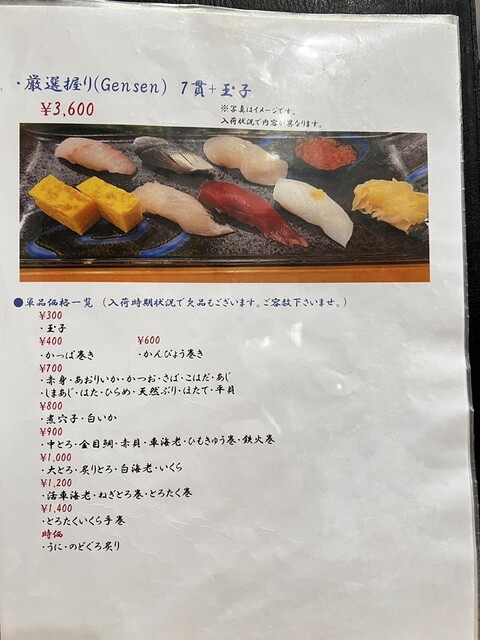 玉子、エビ、マグロ 赤身、中トロ、大トロ、鉄火巻き、穴子(塩とタレ)など