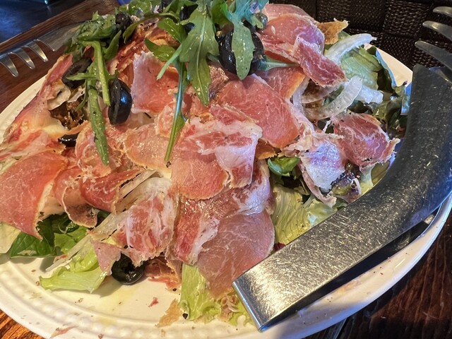 生ハムと野菜のピザは、驚き‼️ 生地とサラダが別々に来るシステム…この野菜を生地に乗せて食べるタイプ!これまた、最高 生ハムとオリーブそして新鮮な野菜のオンパレード!サラダだけでも美味しくいただけちゃうヤツです