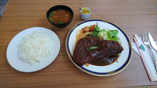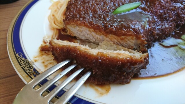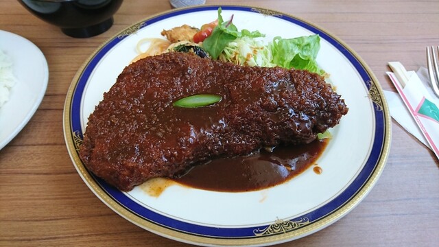 分厚いかつ…もといスカロップにナイフを入れて…うおっ!?かなりの肉厚!!しかも見てのとおり、大人のてのひら1つ半くらいあります。それにタップリとかかったデミグラスソースというのか何というのか。デミグラスソースにウスターソースを僅かに混ぜたような酸味を感じましたが、デミグラスソース自体に複雑な風味を感じました。