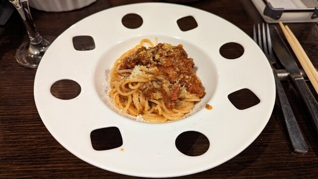 何とも洗いにくそうなパスタ皿(余計なお世話w)にチョボンと盛られたパスタはやや細め。ミートソース…もといラグーソースは深いコクがあってウマいです♡♡