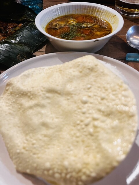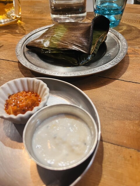 これはきっと美味しいぞと思わせるネーミング。暖かくなっているバナナリーフの包みを開封すると実に香ばしい。独特のやや辛をそのままでいだだいたり、ヨーグルトみたいなソースにディップしたりで普段はあまり出会わない味を舌鼓。ビールとも合います。