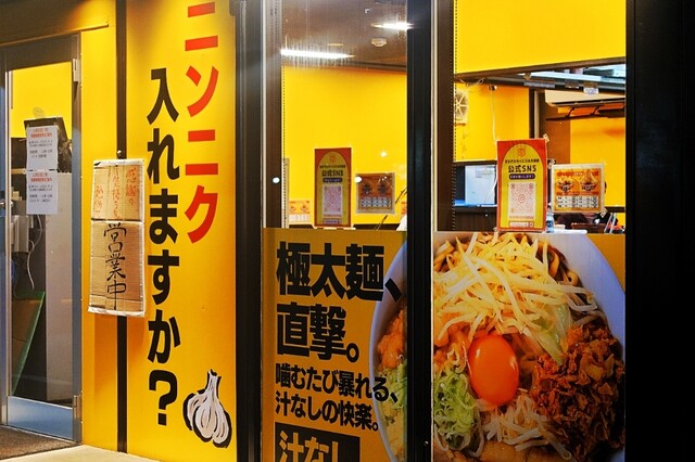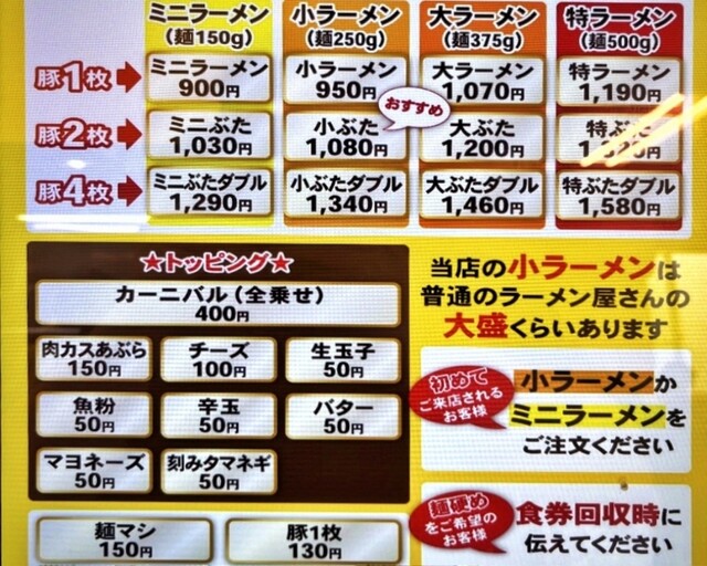 今回は、小ぶたダブル(麺250g・豚4枚)、野菜マシマシ(600g)・にんにくマシ・背脂マシ、有料トッピングの生玉子と刻みタマネギ