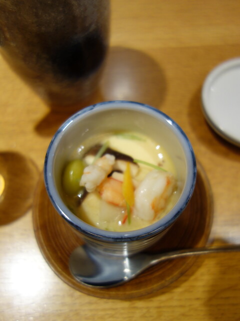 鰻入り茶碗蒸し、椎茸と帆立貝柱の香りのマリアージュが素晴らしい。ギッシリ重たい。お酒を土佐鶴純米にする。