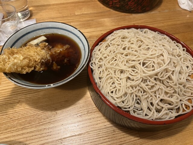 最後はしめのエビ天つけ蕎麦。最後まで天ぷら我慢して正解!胡麻油で揚げた熱熱のエビは尻尾まで完食。蕎麦はつゆで食べて蕎麦湯で飲むのが最高!