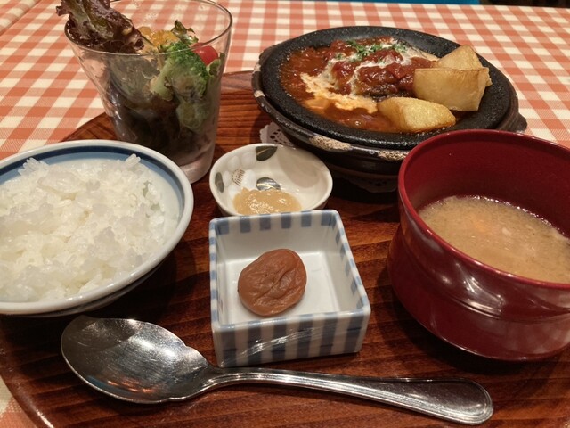 ハンバーグには玉子がのっており、その上からトマト風味のソースがかかっています。