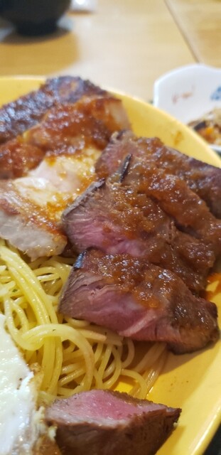 ローストポーク150㌘、ミスジステーキ150㌘、ハンバーグ400㌘、目玉焼き二個、パスタ(ペペロンチーノ)