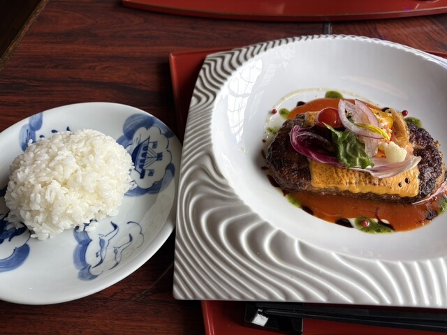 数々の野菜だけでなく、あられ煎餅みたいなのも乗っていて面白い食感のハンバーグになりました。手が込んでます。