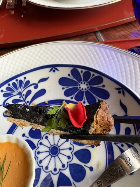 竹炭が練り込まれた玉葱のタルト。竹炭はミネラル豊富でデトックス効果があるようです。食用の花も添えられていて彩りも◯です。