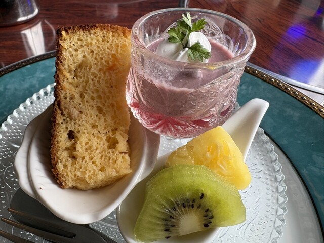 追加のデザートは、栃木の郷土料理しもつかれを使ったシフォンケーキと葡萄のムースゼリーだったかな。シフォンケーキは初めて感じる独特の風味でした
