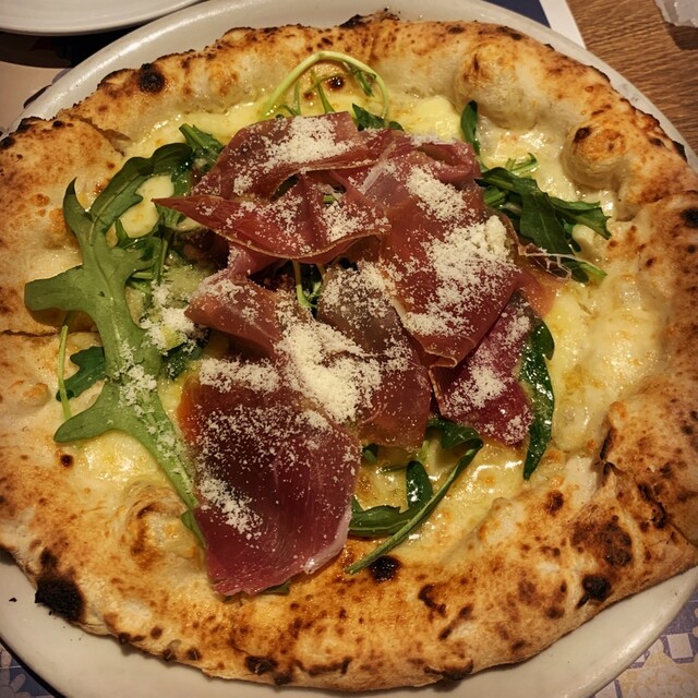 神奈川県民ホールにて森下洋子さん圧巻の舞台を見て興奮冷めやらぬまま旨いピザを食べています。カポナータやらソーセージやらマルゲリータやら、すべて美味しかったけど、このプロシュートとルッコラのチーズベースのピザが秀逸でした。まだまだ食べてみたいメニューがいっぱい!また来まーす♪