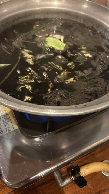 お鍋は白、赤、黒から選べたので興味本位でイカ墨の黒を。コクがあり、本当に出汁が美味しいです。ここでしか食べられない味だと思います