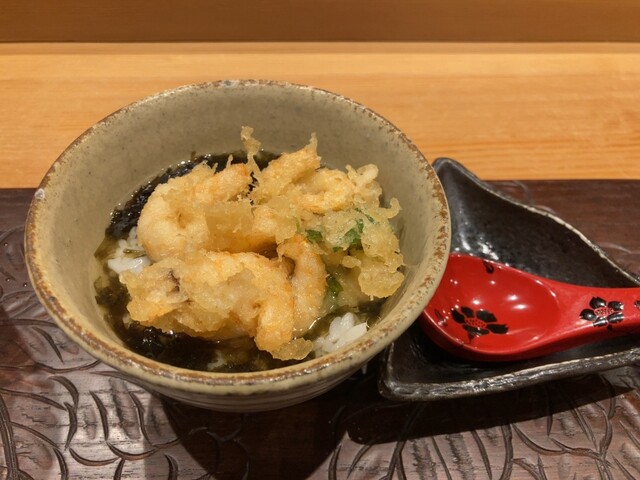 天ぷらは、火入れの加減にこだわっておられ、中心がレアになるくらいの感じで、いただいた中ではアジが一番印象に残りました。ただ、品数が多いのもあって、天ぷらの途中で油が重たく感じることがあり、揚げ油に何を使われているのか気になりました。
