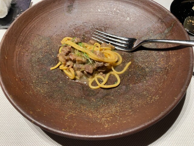 ・キタッラの鴨と白葱ラグーソース、マイクロネギを乗せて
