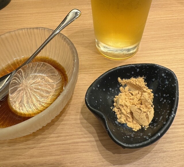 きな粉は別添えです。この透明の美しさにきな粉を入れて混濁状態にするのはちょっと躊躇しましたが、いえいえ、美味しさの前には遠慮は不要ですね。エイっと一気に入れて黒蜜とのコラボを楽しみます。水まんじゅうは逃げるのでスプーンで掬いにくいのですが、なんとか口に運べました。美味しい!滑らかなつるんとした食感からすぐに溶けて、黒蜜ときな粉の風味も味わえました。