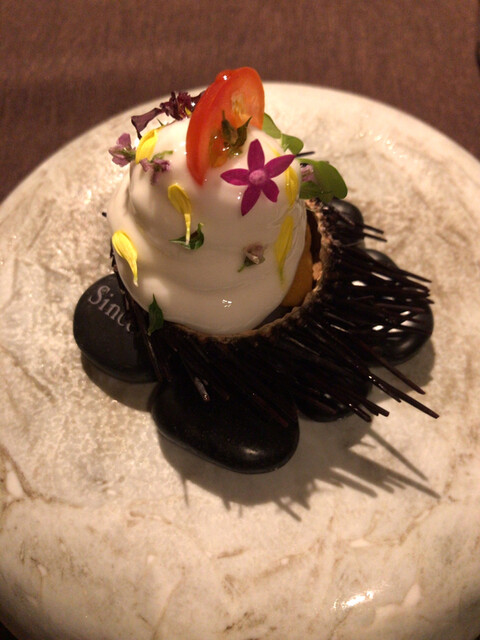 雲丹の殻に盛られた、雲丹をフワフワに泡立てられたトマトと一緒にスプーンで。一品目から大満足⭐️