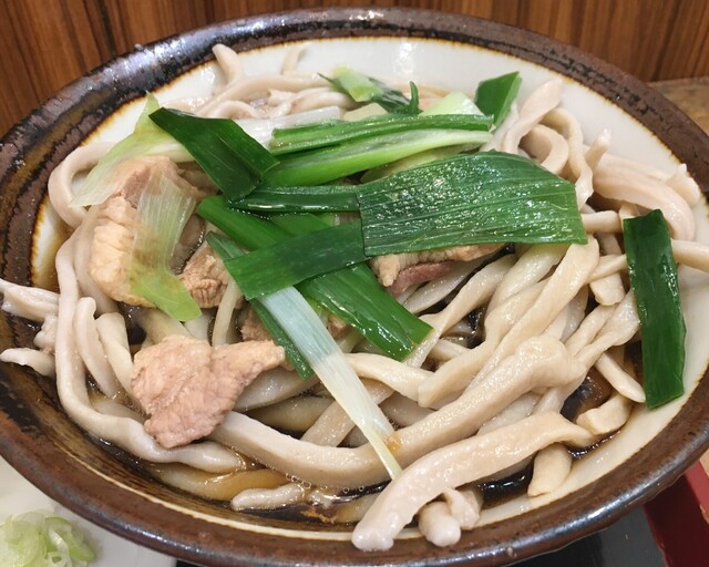 豚肉と長ネギを煮込んだ常温のかけつゆを纏うのは、うどんサイズで乱切りした蕎麦。モノクロ写真なら絶対に田舎うどんと間違える。