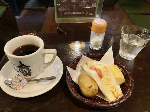 オーダーはサンドイッチ、じゃがいも添え、ホットコーヒーのモーニング。コーヒー美味しい。
