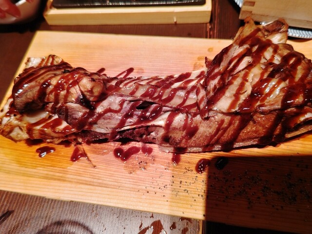 ・限定マグロのカマ焼き、限定5食のラスト1人前でラッキー。バーベキュー風のソースで意外な味付けでニクイ!