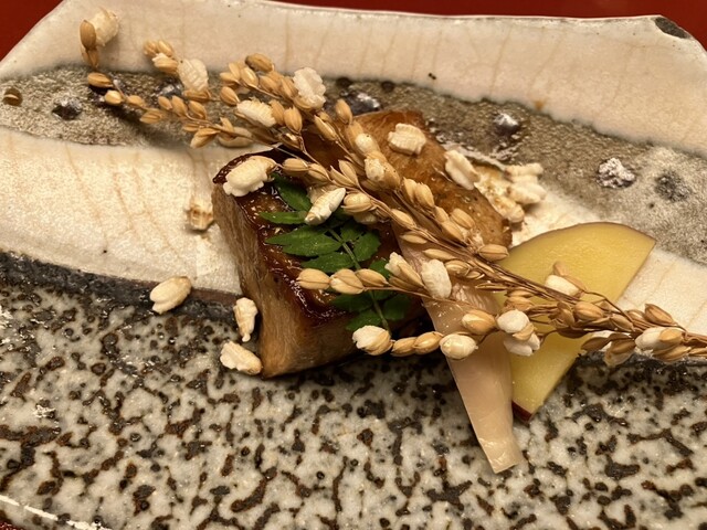 まずは、松茸のフライ。最初見た時は松茸をフライにしてと少し困惑、一口食してみると、強い松茸の香りが広がる感動。香りを閉じ込めた料理なんだと納得。