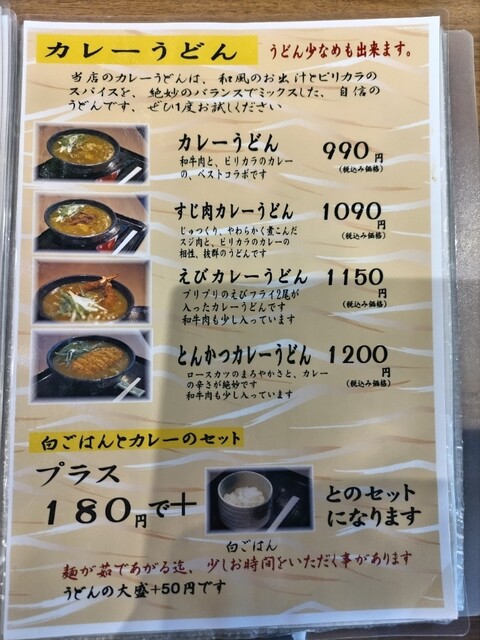 お支払いは現金のみでしたので、お財布にはご注意ください。ここのカレーうどんは自分の中の順位では結構上位に位置するかなと言う評価です。近くに美味しいカレーうどんが食べられる店がありまた、訪問しようと思います。