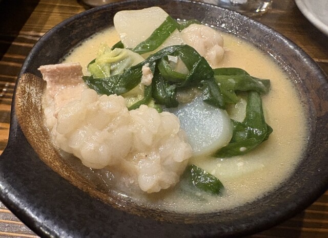 全てのメニュークオリティ高くもつ鍋だけではなく楽しめる。切り込み隊長の柑橘が優しい茶碗蒸し、湯葉の煮びたし、揚げ野菜美味しいサラダ、刺身(本マグロ、鯛、鰤)、天ぷら(万願寺とうがらしと茄子)、地鶏モモ焼、味覚研ぎ澄まされたところで堂々登場、今晩の主役京風もつ鍋は圧倒的存在感(追加料金のもつ追加ありでカバー写真のゴリゴリ量)、白味噌のスープにニンニクとニラとキャベツがモリモリ。
