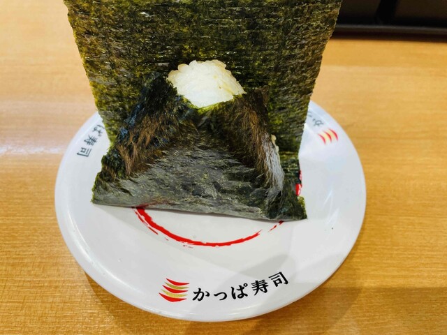 おにぎりは酢飯に甘タレがかかっていて甘味がすこし強いタイプで刻みタクアンが入っています