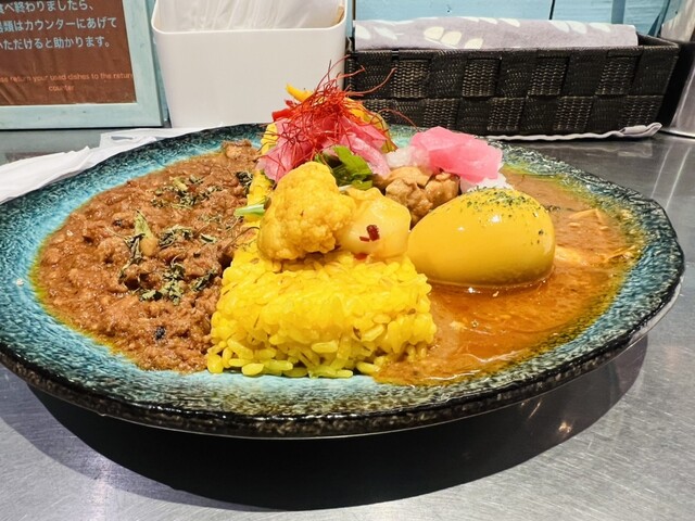 何杯でも行けそう♪もう一つのほうは日替わりの生姜醤油キーマとの事。こちらも中々旨いです!いや〜ご飯がススムーーーーっ5分で完食♪個人的にはチキンカレーの方が好みでした。また卓上にオリーブオイルとナンプラーをミックスした調味料が置いてありコレをカレーにかけると味変になってさらに旨いです!