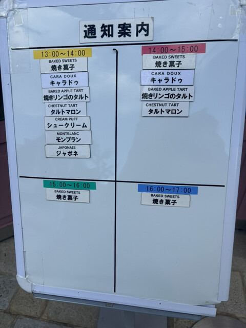 ホワイトボードを見た感じ、1時間の中で 焼き菓子類→キャラドゥ[チョコレートケーキ]→焼きリンゴタルト→タルトマロン→シュークリーム→モンブラン→ジャポネ[ショートケーキ]の順で受け渡しが行われていたようですので、