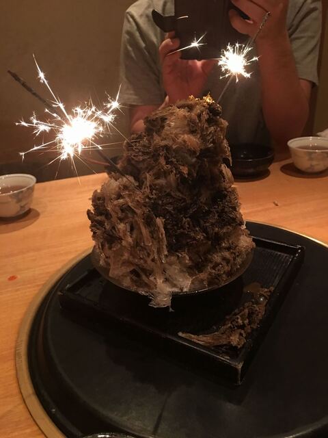 汁も飲み干しフィナーレのかき氷、濃厚ではあるが甘すぎないほうじ茶シロップを雪のような削り氷にかけて。