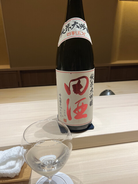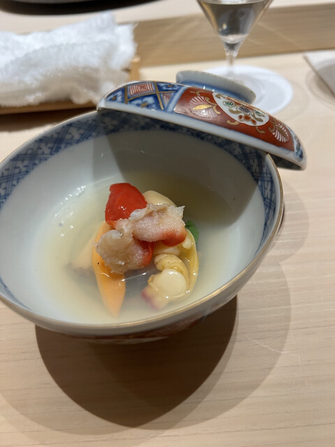 摘みの一品目に出された、レア目に火を通した河豚の切り身の上に河豚の白子を重ねたものがとても美味しくて、めちゃくちゃ好みでした。