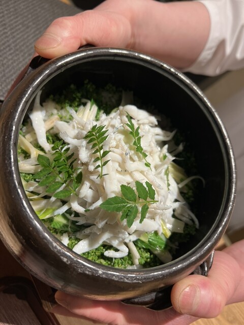 一本釣りの鰆もレアに仕上げられておりとても美味しいですね。更に付け合わせのセリの胡麻和えは本当に悶絶する程美味しく、その次に頂いた白甘鯛のフライ(?笑)と、(広島では当然の付け合わせである笑)梶谷農園さんのハーブの白味噌ドレッシングが最高過ぎるくらいハマりにハマって、めちゃくちゃ印象に残りました。