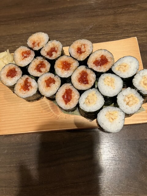 今回このお店に決めたのは筋子の巻物が美味しそうだったから。美味しくておかわりでもう一回注文してしまいました。少しだけお醤油を付けると塩っぱいけど最っ高〜!です。