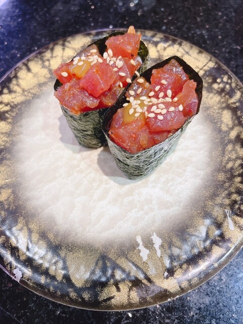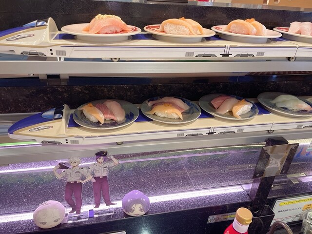 普通の回る寿司屋と変わりませんが、タッチパネルで注文すると北陸新幹線のはくたか号に載って運ばれてきます。とても楽しいです。
