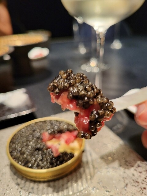 キャビアの下にもユッケが 入っている。真珠貝のスプーンが相当可愛い❤️ 蓋を開けると圧巻のキャビアが詰まってるのも セレブになった気分を味わえる