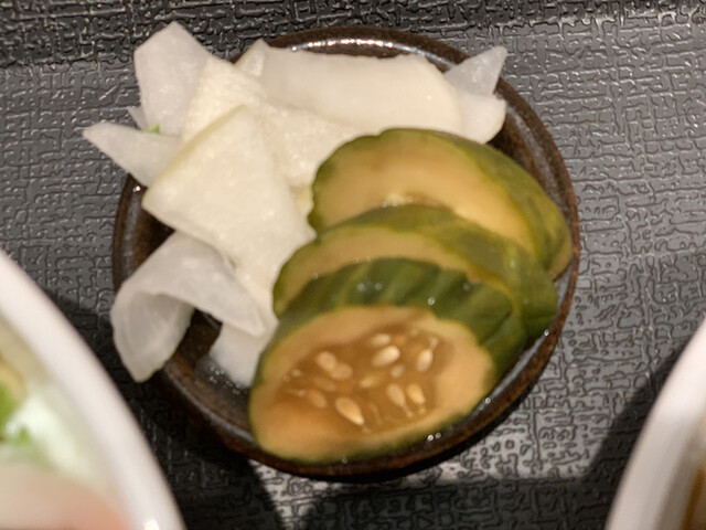 加えて特筆すべきは漬物。深く漬かった胡瓜と大根の糠漬けがたっぷり。発酵した美味しさがとてもよく、揚げ物のお供にぴったり。値段も手頃だし、リピート間違いなし。