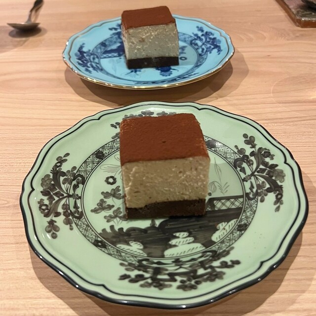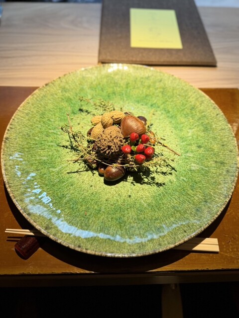 お水のグラスは大阪の工芸の「天満切子」前菜4品目のお皿は人間国宝の井上萬二さんの作品だそう✨