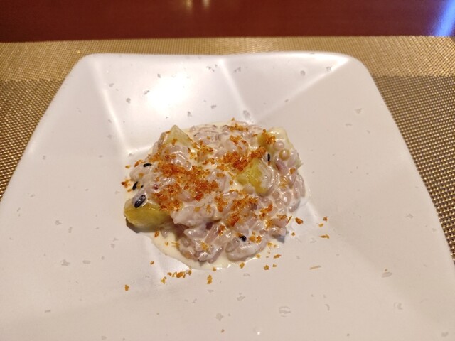途中で提供される丸パン(お代わり可)が割った瞬間に良い香りで、お聞きするとバジルが練り込まれているとのこと。