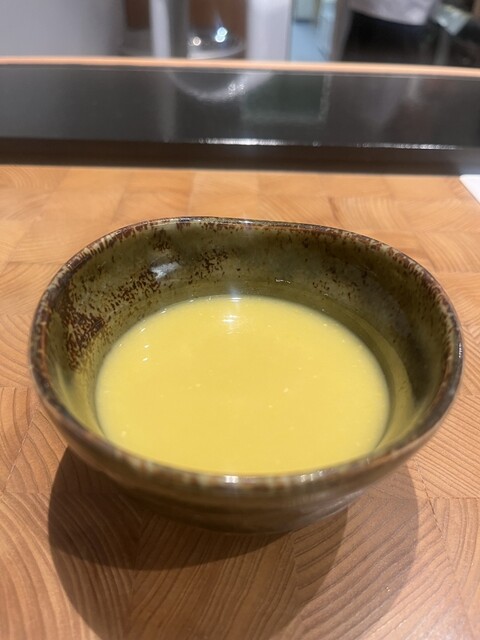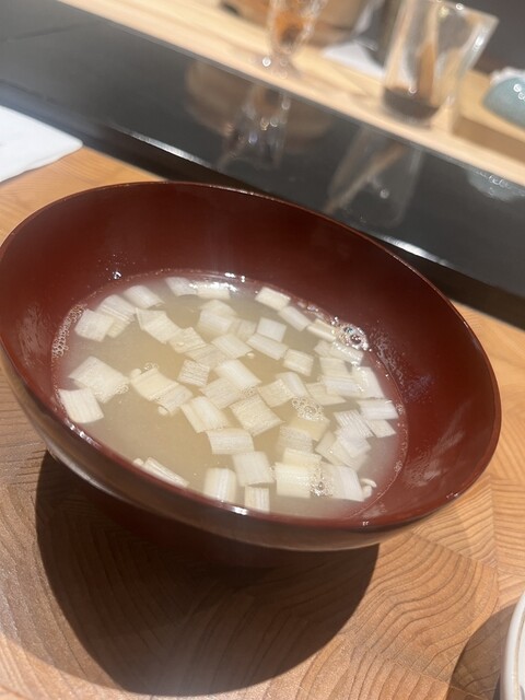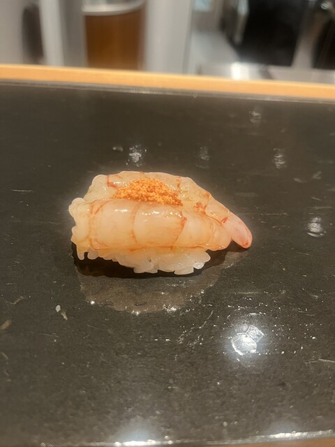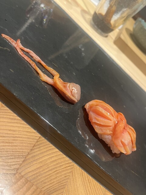 味:至高、米酢と赤酢が織りなすほんのり温かみのあるシャリ(みずほの輝き)にどのネタも合う、アオリイカ(すだちの風味が香り隠し包丁によって口の中で溶ける)、クロソイ、赤しまえび(甘エビの上位互換、まるでアオリイカのような粘り気、甘みに赤しまえびの殻を粉砕したふりかけがえびの風味を増加させる)、アズキハタ(すだちの風味としっかりした歯応え)、真鯛(皮からも旨みが溢れる)、赤貝(貝柱つき、少し柔らかくゆっくりと楽しめる)、アイナメ、赤身(藤田水産、全くひっかかりがなく少し噛むと旨味とシャリと共に消えていく、人生1の赤身)、中トロ(藤田水産)、汁物(白身魚とえびの頭を大鍋で半分になるまで煮詰めて、煮汁に鰹出汁を加えて調整、えびの旨みがまず走ってきて、魚の旨みが押し寄せる、煮汁だけでラーメン提供予定とのこと)、チカメキントキ(追加、根付魚でほぼ動かないことで脂がのった柔らかい身が特徴)、コハダ、穴子(噛まずとも口の中でとろける)、鯵、手巻き(塩水うにと鮪)、紅茶プリン(黒蜜つき)
