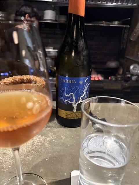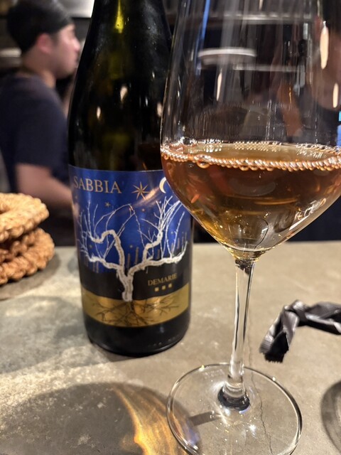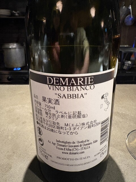 DEMARIEのSABBIA、Arneis、イタリアピエモンテ州の白ブドウの品種をオレンジワインで。衝撃的においしい。白ワインのような軽やかな挨拶の後に、皮の微かな渋味が喉の近くから口の中に広がる。