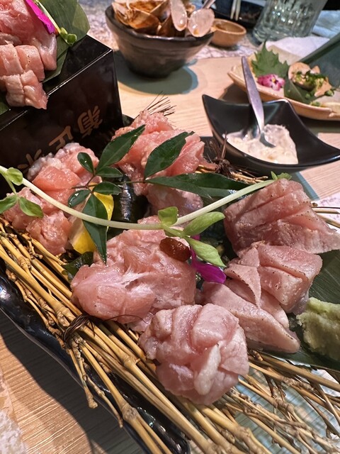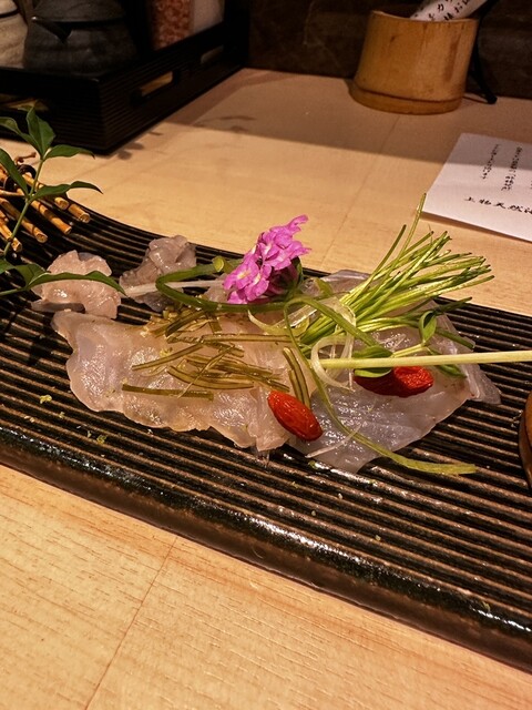 •本日の天然地魚三種造里2598円(相場7千円を超える造里 全国から名古屋市中央卸売市場本場の競り場に集まった中で正真正銘の一番手の上物、又は天然虎河豚のふぐぶつ鉄刺が入ります 養殖物ではなく漁師が命懸けで捕る本物の刺身を魚の中から旨味を高めたり、昆布〆、熟成、焼き霜造里、稲藁燻製叩きなど様々な仕事をしてます)