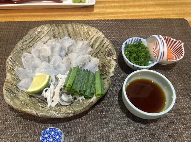 ふぐ刺は、ふぐ皮とネギを添えて頂きました。コリコリの食感、ふぐの旨味と薬味の食べ合わせが堪らない美味しさです。