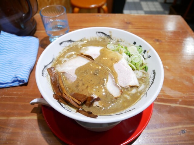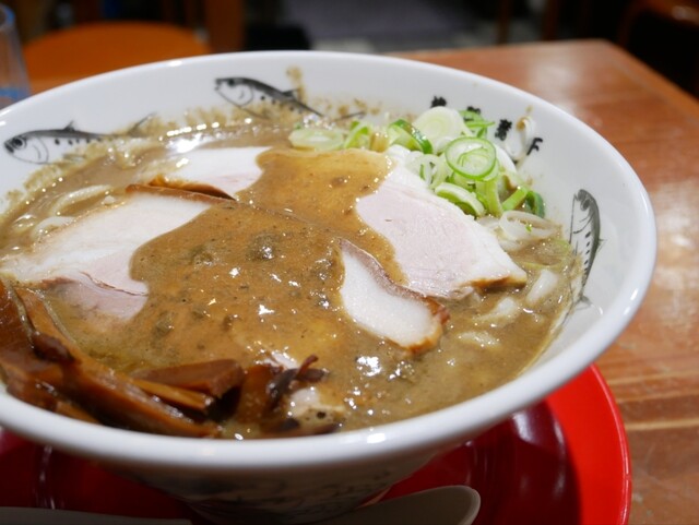 トロッとした濃度の濃煮干しスープは、透明感は無くセメント色をしています。表面に煮干しの肉片や節類の細かい破片がたくさん浮いています。