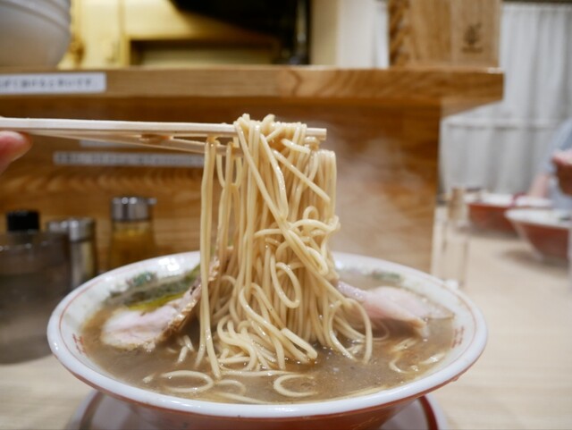 動物清湯出汁に鰹節出汁を合わせたスープは、透明感があり濃いめの醤油の色合いで表面には香味油が浮いています。麺は手揉み中太ちぢれ麺、チャーシュー2枚、花鰹節、ナルト・海苔1枚、メンマ、ネギが盛り付けられています。
