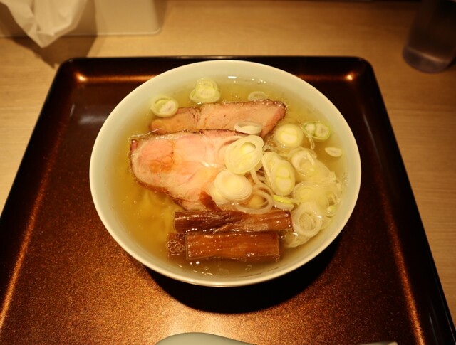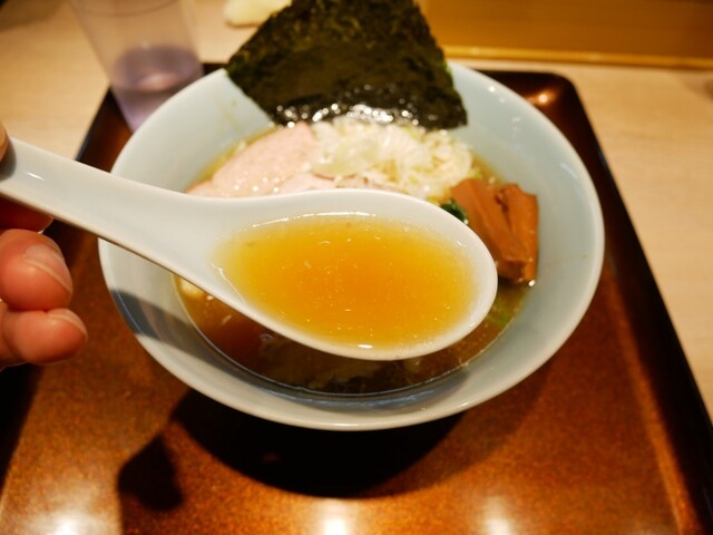 鶏清湯出汁ベースに魚介出汁と塩ダレを合わせスープは、透明感があり黄金色で表面には香味油が浮いています。