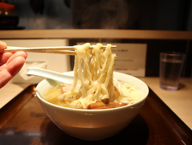 ツルツルと麺肌は滑らかな舌触りで、コシと弾力が程よくモッチモチの心地よい歯応えが素晴らしい!注文後製麺するスタイルが見ていても楽しめます。