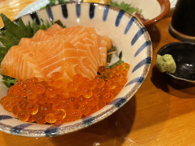 サーモンイクラ丼(小):これだけの食材のご飯ものだから、上品に盛っても十分ご飯は進むであろうと想定してラストオーダーに選んだら。。。えっ!?10切れも?ご飯に対して具が多すぎない!?と思う位。