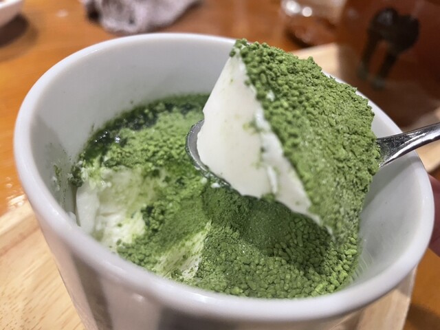 粒々の顆粒状の抹茶糖がシュワっと口溶けその中からもちっとした杏仁豆腐。いはゆる杏仁豆腐とはちょっと違う感じもしますが新食感!