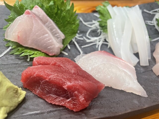 刺身の盛り合わせはヒラスやカンパチはプリプリイカは旨味と歯応えがバランス良く食べれる身厚。ホンマグロは柔らかさとねっとりとした美味さ。