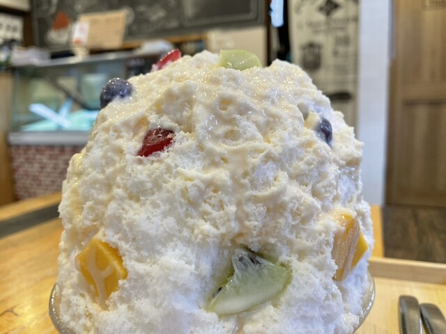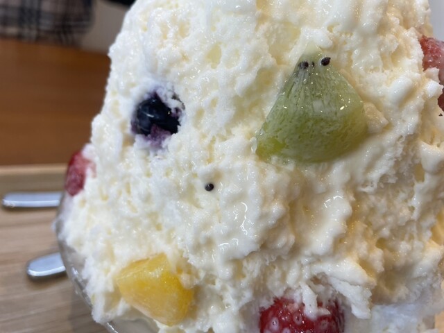 表面の練乳とアイスフルーツキューブと絡めて食べるも美味し。中の何もかかっていない氷もほのかにクリーミーで美味し。帰りにお聞きしたらミルク氷を極細に削ってるんですって。